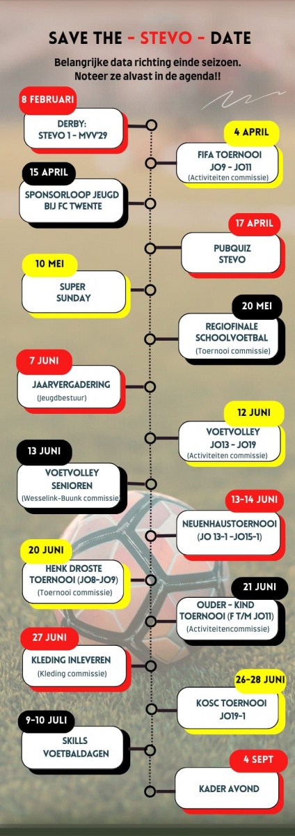 Er staan dit jaar tal van activiteiten op de rol voor de jeugdafdeling van STEVO en de senioren. Bijgaand een overzicht om alvast in de agenda te noteren.Er staan dit jaar tal van activiteiten op de rol voor de jeugdafdeling van STEVO en de senioren. Bijgaand een overzicht om alvast in de agenda te noteren. Klik op de foto.