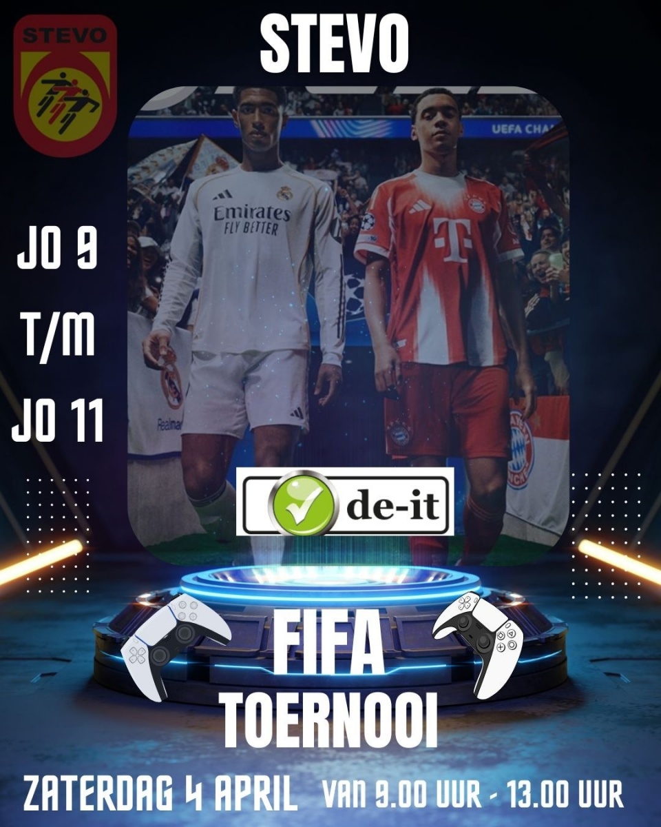 Op zaterdag 4 april 2026 organiseren we bij STEVO een knallend FIFA-toernooi voor onze JO9- t/m JO11-spelers!