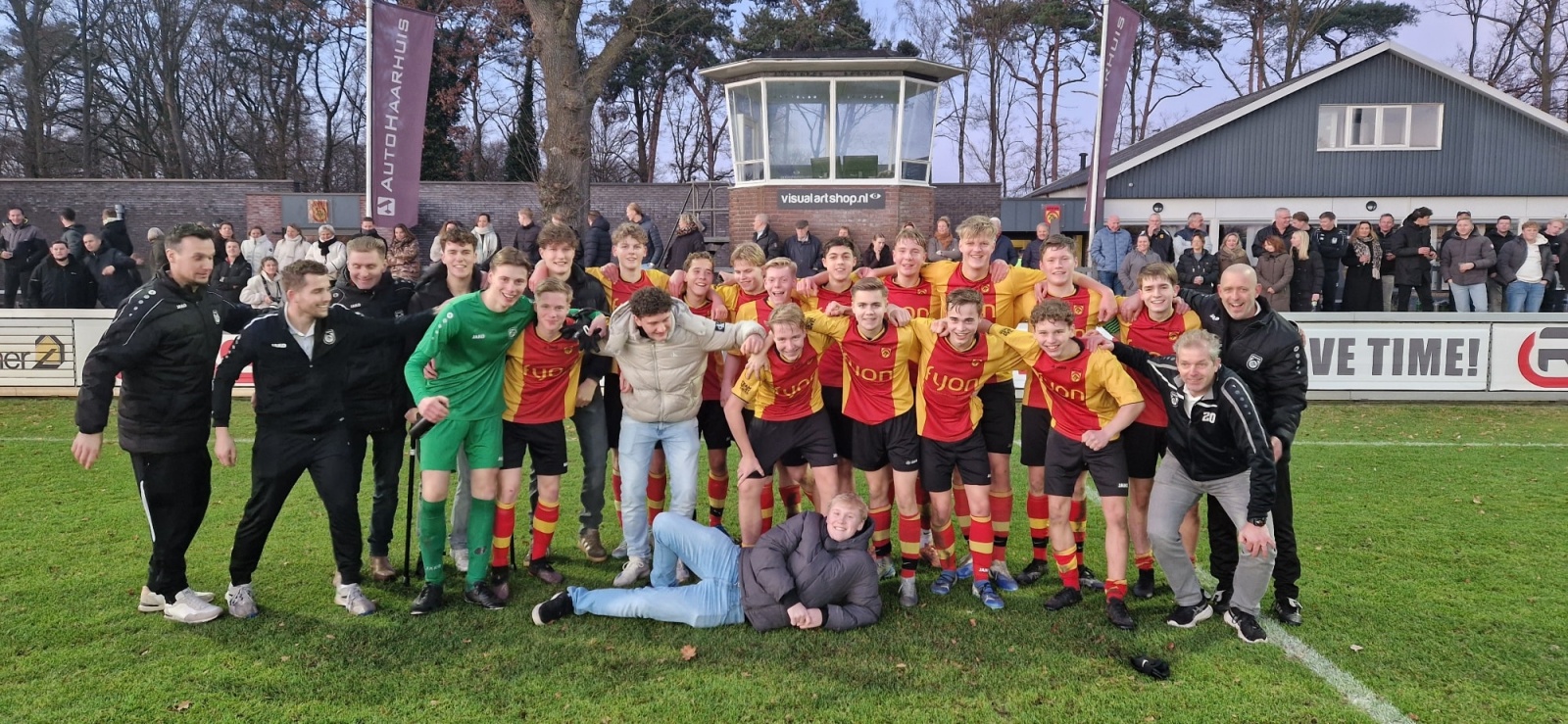 Na het laatste fluitsignaal volgden uitzinnige vreugde, een trotse kampioensfoto en lovende woorden van jeugdvoorzitter Kasper Olimulder, die op het hoofdveld de loftrompet stak over deze geweldige groep. De medailles werden omgehangen, felicitaties vlogen in het rond en één ding was zeker: dit succes wordt vanavond uitbundig gevierd.