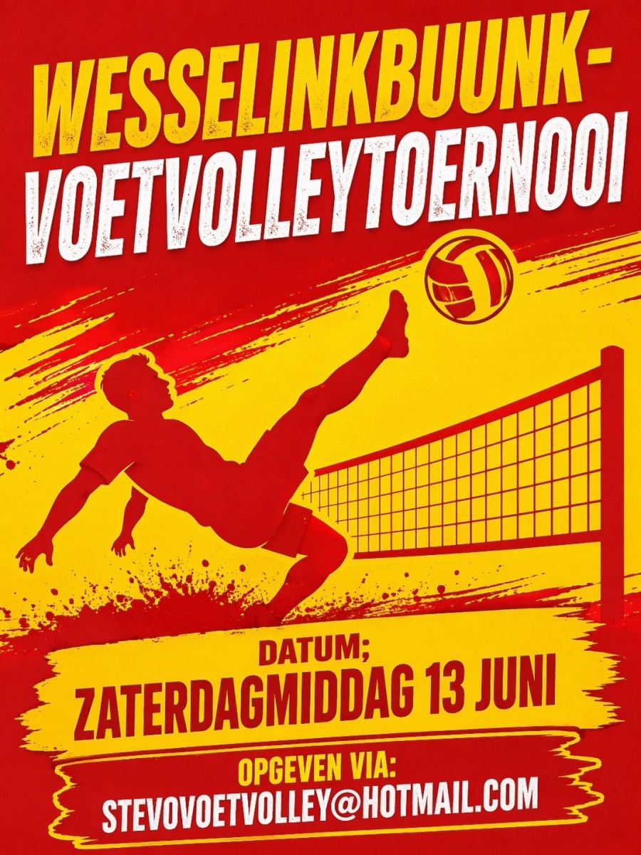 Zaterdag 13 juni wordt het 11e Wesselink Buunk Voetvolleytoernooi met deelname van 60 teams gehouden. Er is nog plek voor 8 teams. Wees er snel bij want vol is vol.